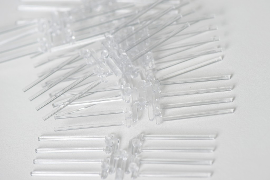 Injection-molded clear plastic rods, 1.59mm x 1.59mm x 32mm. These "Type-I" rods have a small nub that can be used as a reference point to determine the collection side of the sampling rod. Rods are available ungreased in packages of 100, or pre-greased in larger quantities.