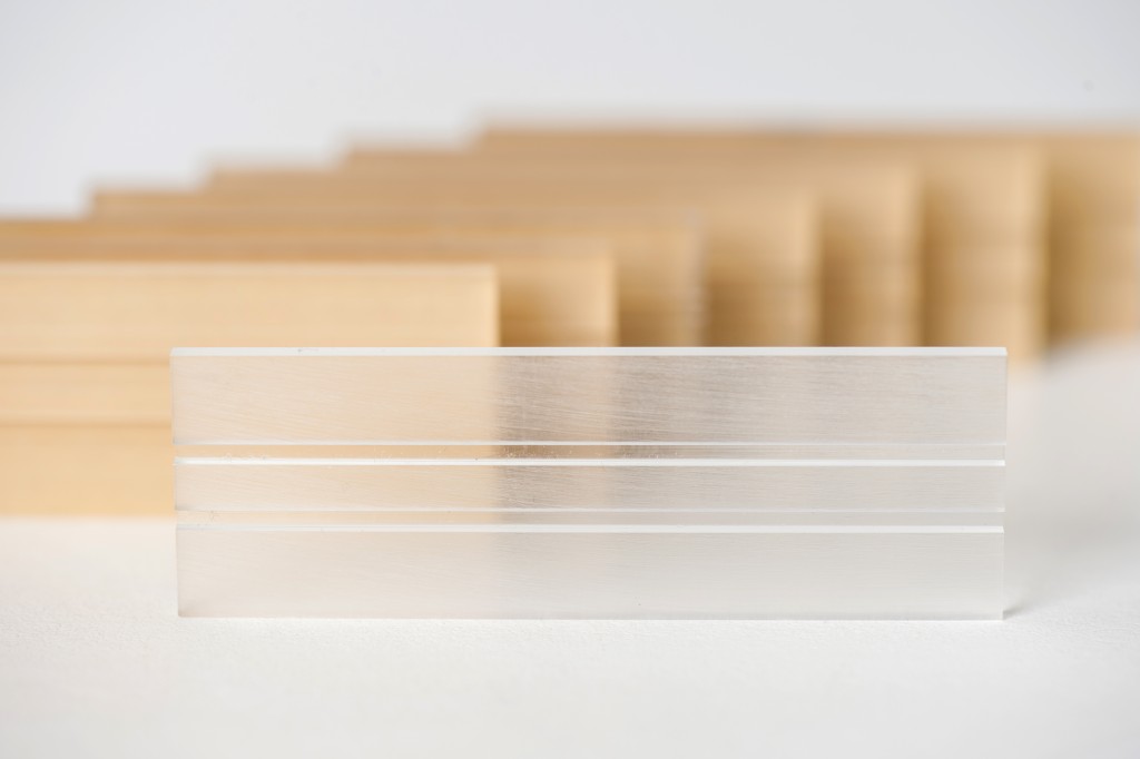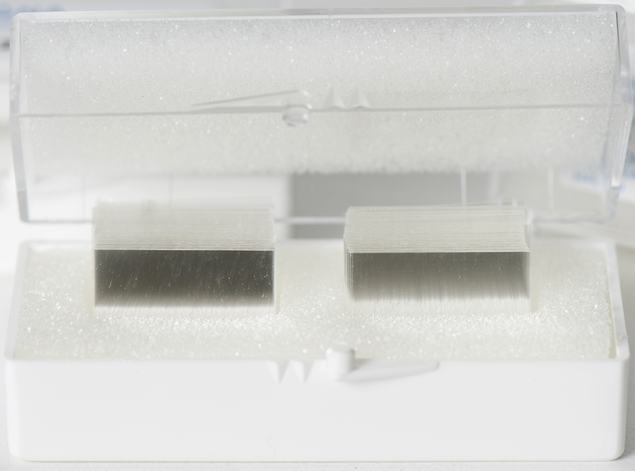 Microscope slide used for mounting sampling rods for analysis, sometimes referred to as a microscope stage adaptor. This clear plastic slide is machined with two polished grooves so that up to two "Type-I" rods (1.59mm width) can be analyzed at a time.